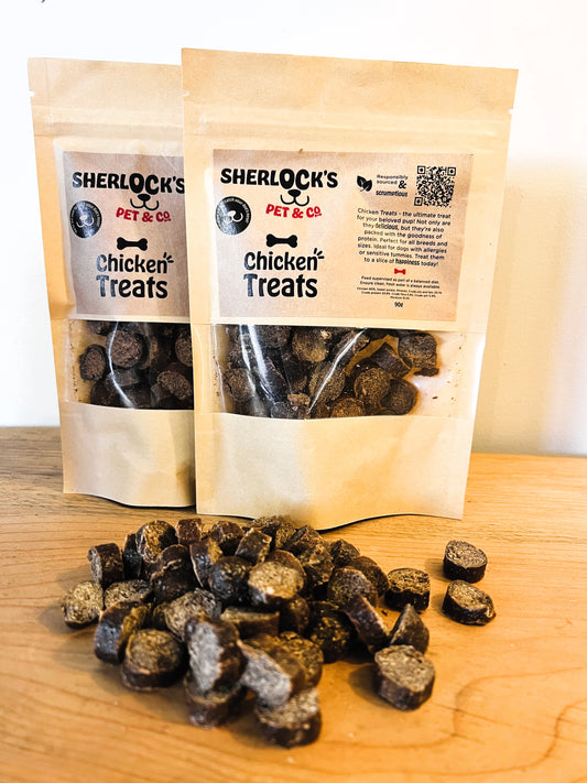 Discover our convenient collection of natural dog treats in easy-to-use pouches at Sherlock's Pet & Co. Keep dog treats fresh and exciting with our variety of delicious flavors, including protein-rich Venison dog treats, wholesome Veggie dog treats, and Omega-3 packed Fish Cube dog treats. Find the perfect high-quality treat for your beloved companion!